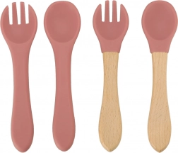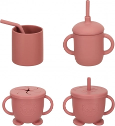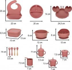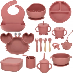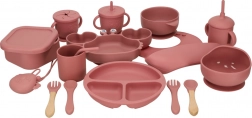 Complete siliconen kinderserviesset in donkerroze bevat borden, kommen, bekers en bestek. Het servies is gemaakt van veilig siliconen, is eenvoudig schoon te maken en ideaal om zelfstandig eten aan te leren.