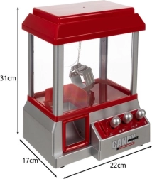 Bediening en MECHANISME voor het vangen van snoepjes - De snoepgrijper werkt als een echte automaat. Aan de voorkant van het speelgoed bevinden zich drie joysticks van duurzaam PS, die volledige controle over de klauw bieden. De eerste joystick beweegt het mechanisme vooruit en achteruit, de middelste naar rechts en links en de derde laat de stalen klauw zakken en heffen, bevestigd aan de portaalarm met een robuuste ketting met een oog. Het hele vangen van snoepjes is uitzonderlijk vloeiend en realistisch en de vreugde van het grijpen van favoriete lekkernijen wordt nog vergroot door het speelse avontuur. Na het vangen van een snoepje wordt het snoepje handig gedeponeerd in de rood verlichte opening, wat het spel extra fun geeft.