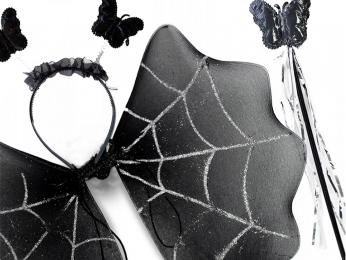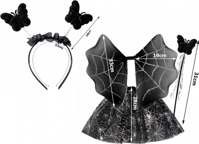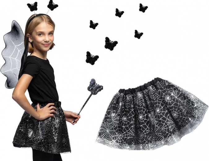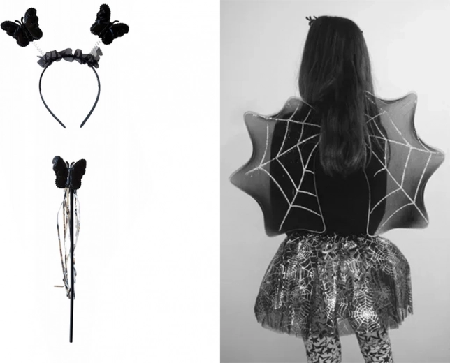 Dit Halloweenkostuum voor kinderen combineert een betoverende look met comfort. De zwarte tulerok met zilveren spinnenwebprint glinstert prachtig, de lichte vleugels met elastiek zijn eenvoudig aan te trekken en de haarband met vlinders op veertjes voegt een speels accent toe aan het geheel. Alles is gemaakt van licht polyester dat niet belemmert in de beweging.