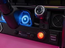 LED‑lichten voor en achter, bovenlampen en een audiopaneel met USB/MP3/Bluetooth/AUX, melodieën en claxon op het stuur.