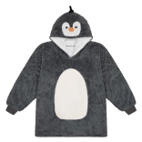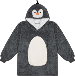 De draagbare pinguïndeken beschikt over een ruime capuchon en een grote voorkantzak, die je handen warm houdt.