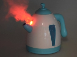 De theepot is uitgerust met een knop die de simulatie van het koken van water start met realistisch geluid en een rode LED-indicator.