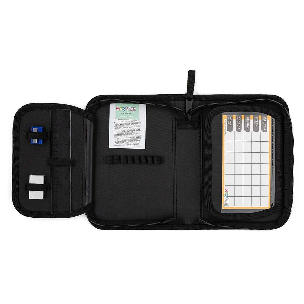 Op de binnenkleppen vind je transparante hoesjes voor het eenvoudig plaatsen van het lesrooster of notities. De etui is leeg, zodat je deze precies naar eigen behoefte kunt inrichten. Dankzij de compacte afmetingen en het lage gewicht past hij perfect in een schooltas of rugzak.
