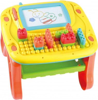 Een leuk dubbelzijdig tafeltje voor kinderen met twee speelvlakken in één: aan de bovenkant vind je een stuur, versnellingspook en rammelaars, aan de onderkant een magnetisch tekenbord en een bouwplaat voor blokken. In de verpakking zitten blokjes, melodieën en batterijen, dus direct klaar voor gebruik. Het compacte formaat van 37 cm past in elke kinderkamer.
