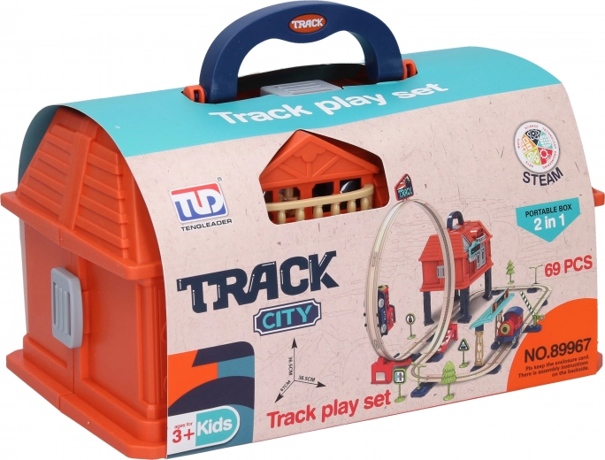 Ontdek de leuke treinbaan in een praktisch koffertje met 69 delen, die kinderen urenlang vermaakt. De set bevat een batterijlocomotief, rails, een gebouw en halte, slagbomen, verkeersborden, bomen en lichten. Eenvoudig starten van de locomotief via de schoorsteen (ON/OFF-knop) en een afbeeldingshandleiding aan de binnenzijde van de verpakking zorgt voor snel opbouwen.
