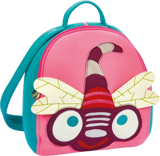 Lichte en kleurrijke kinderrugzak met libellenmotief, ideaal voor kleine ontdekkers vanaf 18 maanden. Voorzien van comfortabele, verstelbare schouderbanden, een praktische handgreep voor eenvoudig dragen en compacte afmetingen voor dagelijks gebruik naar de peuterspeelzaal of op uitstapjes.