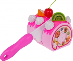 Deze rijk uitgeruste roze verjaardagset verandert de kamer in een kleine patisserie. De zestaart met klittenband kan met het bijgeleverde mes “gesneden” worden en versierd met fruit, koekjes en schattige accessoires. De grote kaars licht op in twee kleuren na een druk op de knop (RL41-batterijen inbegrepen) en zorgt voor een magische feeststemming.