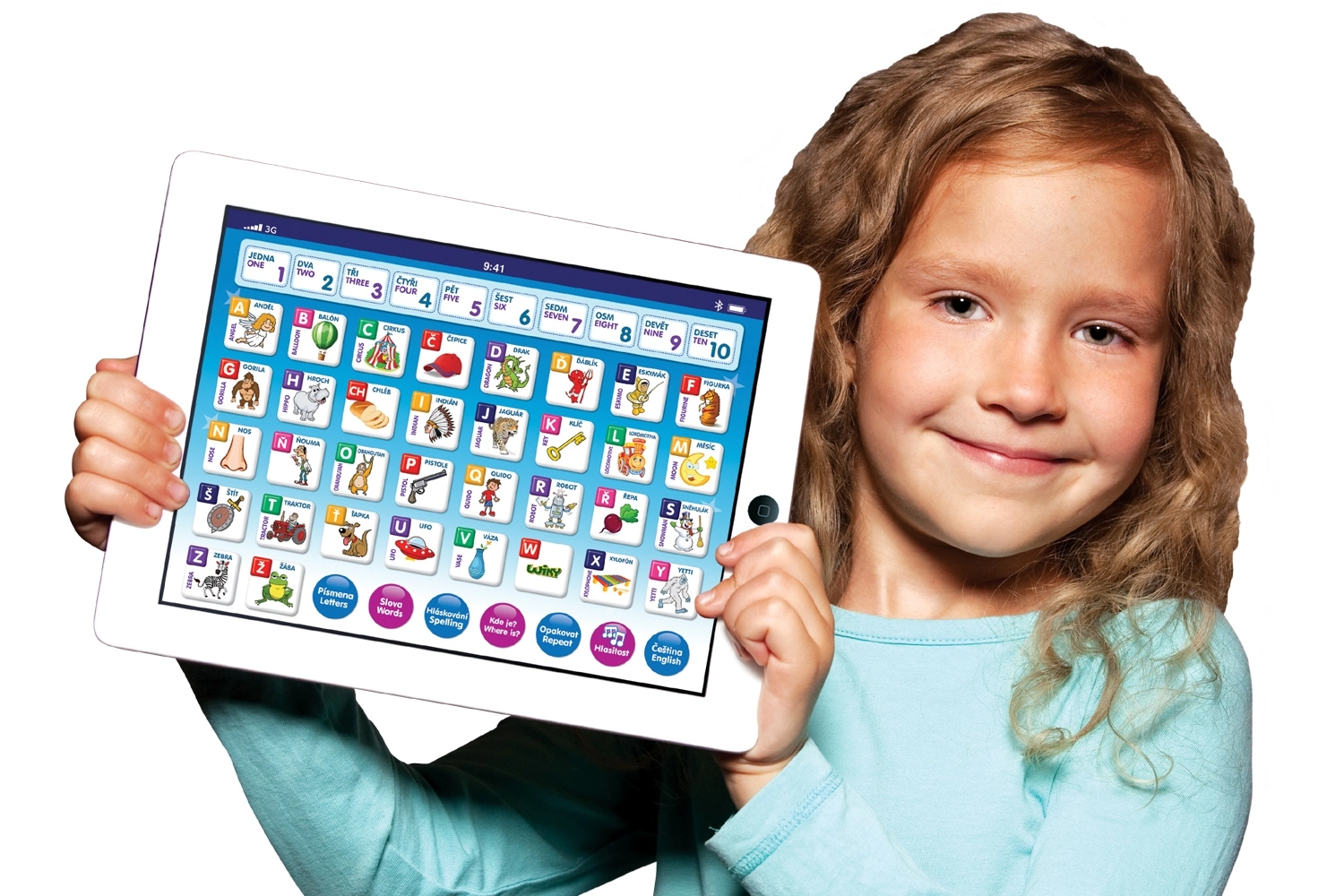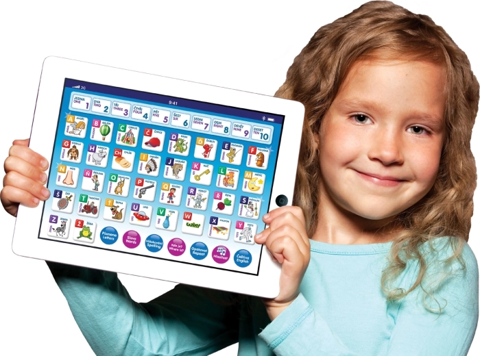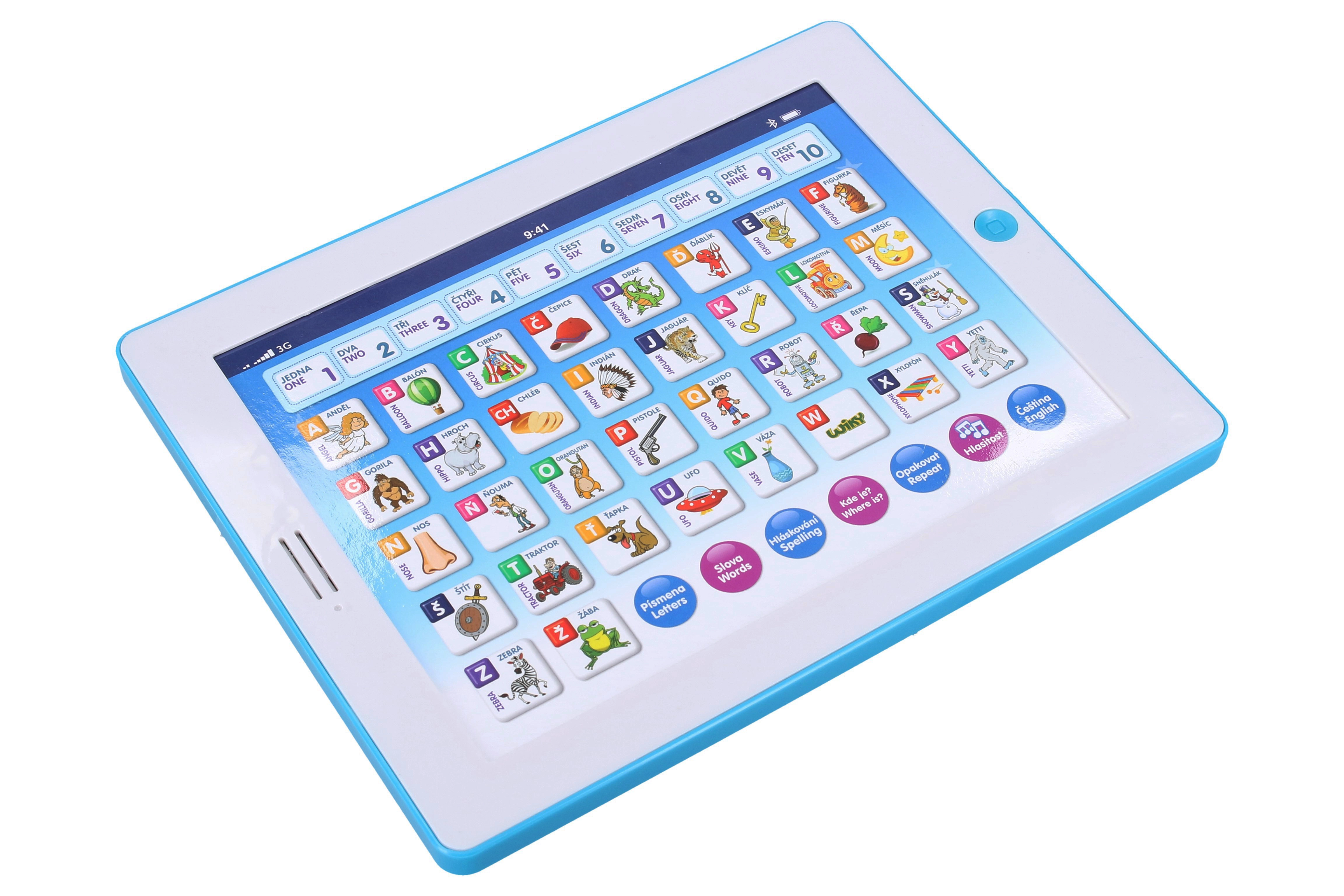 Leuke en educatieve kindertablet voor kleine ontdekkers vanaf 3 jaar. Leert in het Tsjechisch en Engels, helpt bij het tellen van 1 tot 10, het alfabet en spellen. Bevat leuke spelletjes met letters, woorden en cijfers en speelt melodieën af.