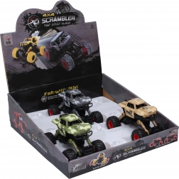 Leuke terreinwagen met opwindmechanisme voor dynamisch rijden op elk oppervlak. Biedt een robuste constructie, functionele vering en compacte afmetingen van 15 × 9 × 9,3 cm. Verkrijgbaar in 3 kleurvarianten – groen, geel, grijs.