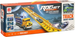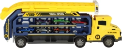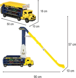 Met een simpele uitklap verandert de vrachtwagen in een tweesporige baan voor spannende autootjesduels – ideaal voor snel en creatief spel.
