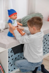 Maak kennis met Jonas! De pop Jonas, bekend uit de animatieserie BABY born die je in het Tsjechisch kunt bekijken op het BABY born-kanaal op YouTube, kun je nu ook thuis hebben. In een nieuwe outfit en met 10 accessoires. Hij brengt een magisch bordje mee: wanneer je een beetje water op het bord met het witte plaatje giet, verschijnt er een heerlijk maaltje met een schattig gezichtje, waardoor het voeden van de pop nog leuker wordt. Als je Jonas na het voeren (met water) of na het drinken uit het flesje op het potje zet en op zijn buikje drukt, verschijnt er op het plaatje in het potje een afbeelding van plassen en poepen. Wanneer Jonas water uit het flesje drinkt, kan hij tranen huilen en moet hij getroost worden. De magische speen kan helpen: draai je hem in zijn mondje 180 graden, dan gaan zijn oogjes open of dicht. Draai nog een keer en het omgekeerde gebeurt. Jonas kan nog meer: hij heeft beweeglijke gewrichten en je kunt hem ook in bad doen. Nu droogt hij zelfs sneller dan ooit: om de pop na het spelen goed schoon te maken, kun je één beentje verwijderen zodat er een grotere opening ontstaat om de pop te reinigen. Zo kan het water makkelijker uit de pop wegstromen. Voor nog boeiender spel neemt Jonas naast het flesje, de speen, het bordje met het plaatje van eten en het potje met het plaatje van plassen en poepen ook een luier, een geboorteakte, een stickervel en twee vriendschapsarmbandjes mee – één voor de pop en één voor haar kleine mama – als bewijs van een langdurige en liefdevolle vriendschap tussen het kind en de pop.
