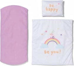 Een heerlijk zacht kussentje, deken en onderlegger met vrolijke teksten en regenboogmotieven maken het mogelijk het uiterlijk van het bedje aan de stemming aan te passen.