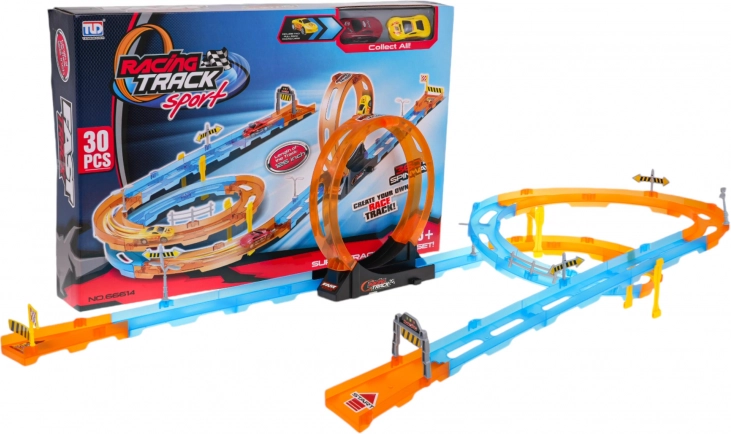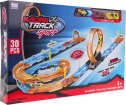 Deze grote en dynamische racebaan is perfect voor kleine coureurs die op zoek zijn naar spanning. De set bestaat uit 30 delen die kinderen zelf kunnen monteren. De baan is verrijkt met verschillende secties, waaronder scherpe bochten met veiligheidsbarrières en twee niveaus, wat garant staat voor maximaal speelplezier.