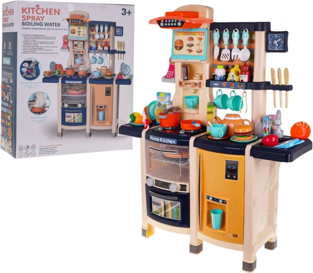 Grote kinderkeuken met een werkende lopende kraan, realistische kooklichten en -geluiden en een rijke set van 65 delen. Inclusief oven, koelkast met waterdispenser, vaatwasser, koffiezetapparaat, bedieningspaneel met ventilator en een telefoon met geluiden. Hoogwaardige kunststof, levendige kleuren en doordachte details stimuleren creatief spel voor kinderen vanaf 3 jaar.