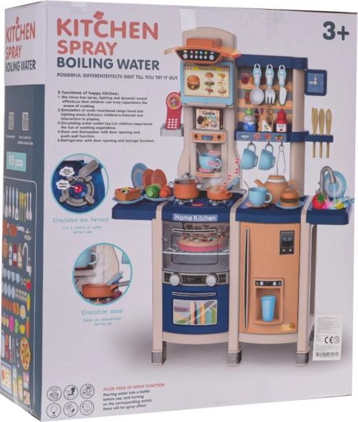 Deze interactieve keuken verandert de kamer in een klein culinair studio. Bij het draaien aan de knoppen gaan de verlichte kookpitten aan en starten bak- en kookgeluiden. Uit de echt werkende kraan stroomt water, zodat kinderen kunnen “afwassen” zoals in een echte keuken. Ook inbegrepen zijn een te openen oven met licht en geluid, een koelkast met een imitatie van een waterdispenser, een vaatwasser en een koffiezetapparaat.