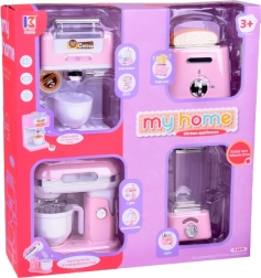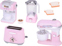 De set van kleine keukenapparaten brengt elegantie en functionaliteit in uw kinderkeuken. Gemaakt van hoogwaardige kunststof met details die echte apparaten perfect nabootsen. De zachte roze kleur met witte en chromen accessoires geeft het speelgoed charme en stijl.