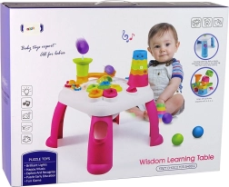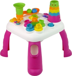 Deze multifunctionele educatieve tafel in roze-wit biedt een brede waaier aan activiteiten voor zintuiglijke ontwikkeling en plezier. Het kind leert spelenderwijs kleuren en vormen onderscheiden, traint manuele vaardigheden en ervaart oorzaak en gevolg – bijvoorbeeld bij het laten rollen van knikkers van de glijbaan.