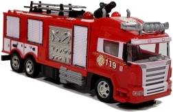 De grote rode brandweerwagen staat op wielen met rubberprofiel. Hij kan gemakkelijk kleine oneffenheden op zijn pad aan. Het ontwerp van het voertuig benadrukt de belangrijkste elementen, waardoor het lijkt op zijn full-size tegenhanger.