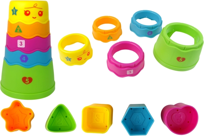 - Een 5-laagse piramide met een opening voor knikkers – stapel van klein naar groot.