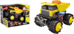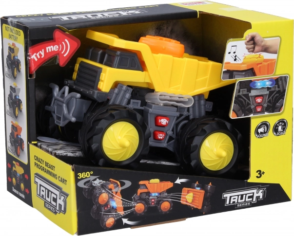 Ontdek de leuke kiepwagen van 15,5 cm die kinderen verrast met licht-, geluids- en bewegingseffecten. Eenvoudige bediening met knoppen op het laadbed en aan de zijkant, 3× AAA-batterijen inbegrepen – klaar voor direct speelplezier.