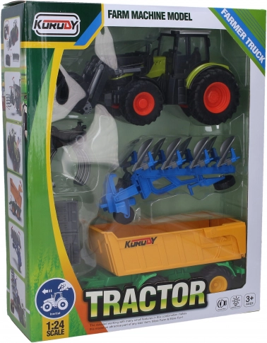 Deze tractorlader is uitgerust met drie aansluitapparaten - één aan de voorkant en twee aan de achterkant, waardoor de speelopties toenemen. Licht- en geluidseffecten activeert u door op het voorste deel van de tractor te drukken, wat realistische speelervaringen oplevert.