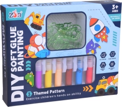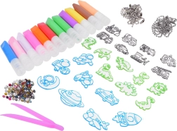 Deze uitgebreide set biedt kinderen een leuke introductie in de wereld van creativiteit. De speciale kleuren worden eenvoudig in de verdiepte lijnen van de sjablonen aangebracht, lopen niet over de randen en helpen om nauwkeurige en indrukwekkende hangertjes te maken. De voltooide motieven versier je met decoratieve steentjes en hang je aan metalen kogelkettingen – ideaal voor sleutels, rugzak of als kamerdecoratie.