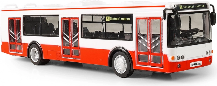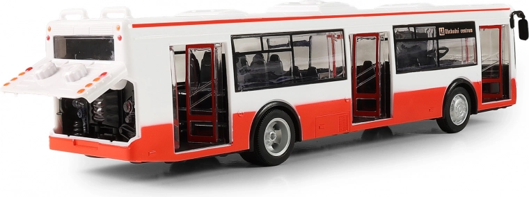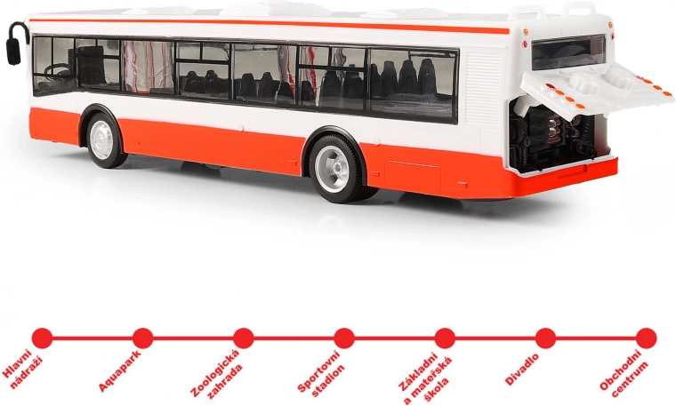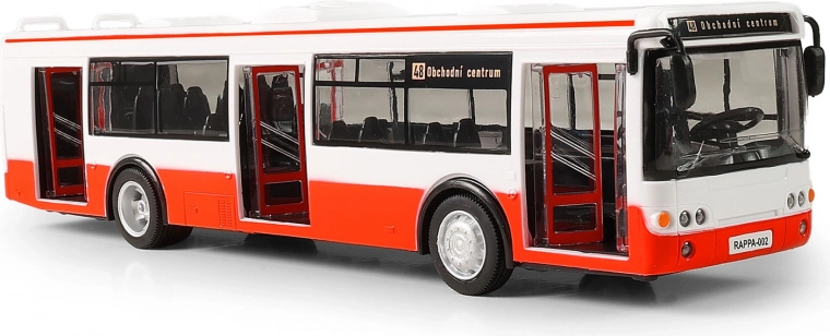 Een leuke en realistische bus in schaal 1:43 die elk kind zal verheugen. Biedt Tsjechische omroepberichten van haltes, licht- en geluidseffecten, openende deuren en pull-back aandrijving. Ideaal cadeau voor jongens en meisjes vanaf 3 jaar.
