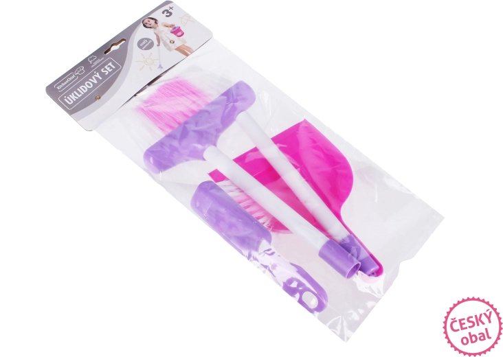 Praktische kinder schoonmaakset bestaande uit 3 delen – blik, handveger en opvouwbare bezem. Gemaakt van duurzaam plastic in roze-witte kleur, ideaal voor rollenspel in het huishouden en het ontwikkelen van de fijne motoriek. De opvouwbare bezem past gemakkelijk in een kleinere speelgoedkrat.