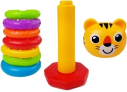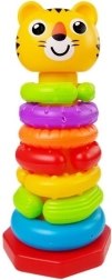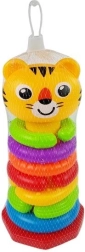 Vrolijke stapelpiramide in regenboogkleuren met een schattig tijgertje bovenop, stimuleert de ontwikkeling al vanaf de eerste leeftijd. Bevat diverse gekleurde ringen en bekertjes die eenvoudig op de pin geschoven worden en kinderen leren sorteren op grootte en kleur. Gemaakt van veilig, niet-giftig plastic en voorzien van afgeronde vormen voor maximale veiligheid. Een geweldige speelgoedset voor de ontwikkeling van fijne motoriek, oog-handcoördinatie en het herkennen van kleuren en vormen.