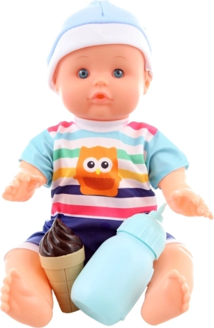 Een schattige baby van 30 cm in kleurrijke outfit met uiltje maakt elke kleine verzorger blij. Dankzij de functie drinkt en plast, de buigzame ledematen en de mogelijkheid om de pop zittend te plaatsen, biedt het realistisch rollenspel in verzorging. Inclusief accessoires – flesje en ijsje. Verkrijgbaar in 2 varianten (levering afhankelijk van voorraad). Geschikt vanaf 3 jaar.