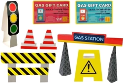 Verkeerslicht, borden, pionnen, barrière en kaarten voor de pomp geven het spel verkeersregels en een realistische sfeer.