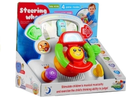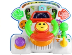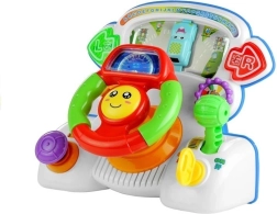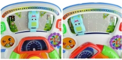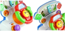 Het interactieve stuur op het dashboard biedt kinderen een realistische rijbeleving in een speelse en veilige vorm. Draaielementen, een versnellingshendel, een sleuteltje in het contactslot en richtingaanwijzers gaan gepaard met knipperende lampjes en verschillende geluidseffecten. Bij het draaien aan het stuur beweegt een blauw autootje over de “weg”, het verschuiven van de snelheidschijf activeert vrolijke geluiden en andere interactieve verrassingen.