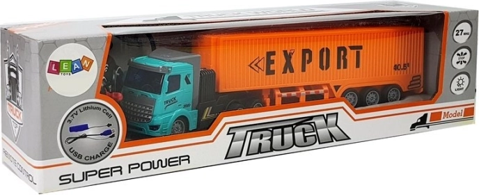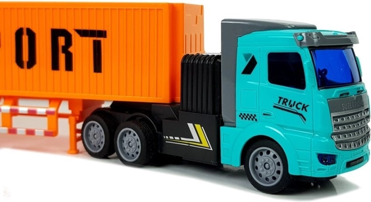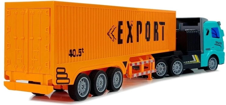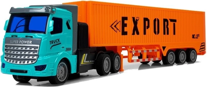 De turkooise cabine en oranje oplegger met de opschriften EXPORT/PORT zorgen voor de realistische look van een echte vrachtwagen – ideaal voor fantasierijke vrachttransporten.
