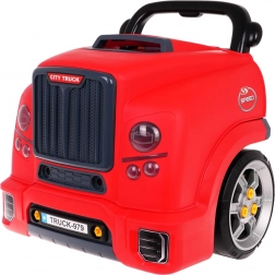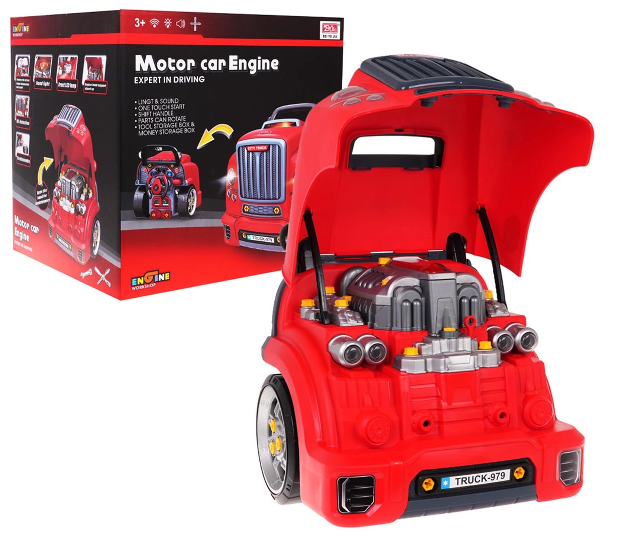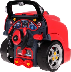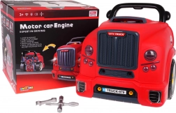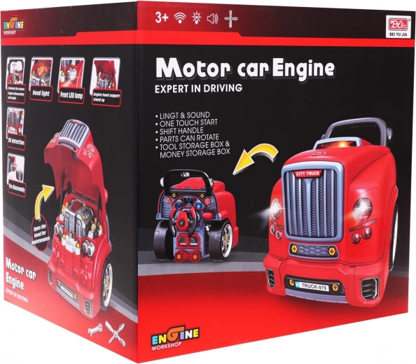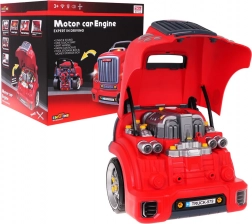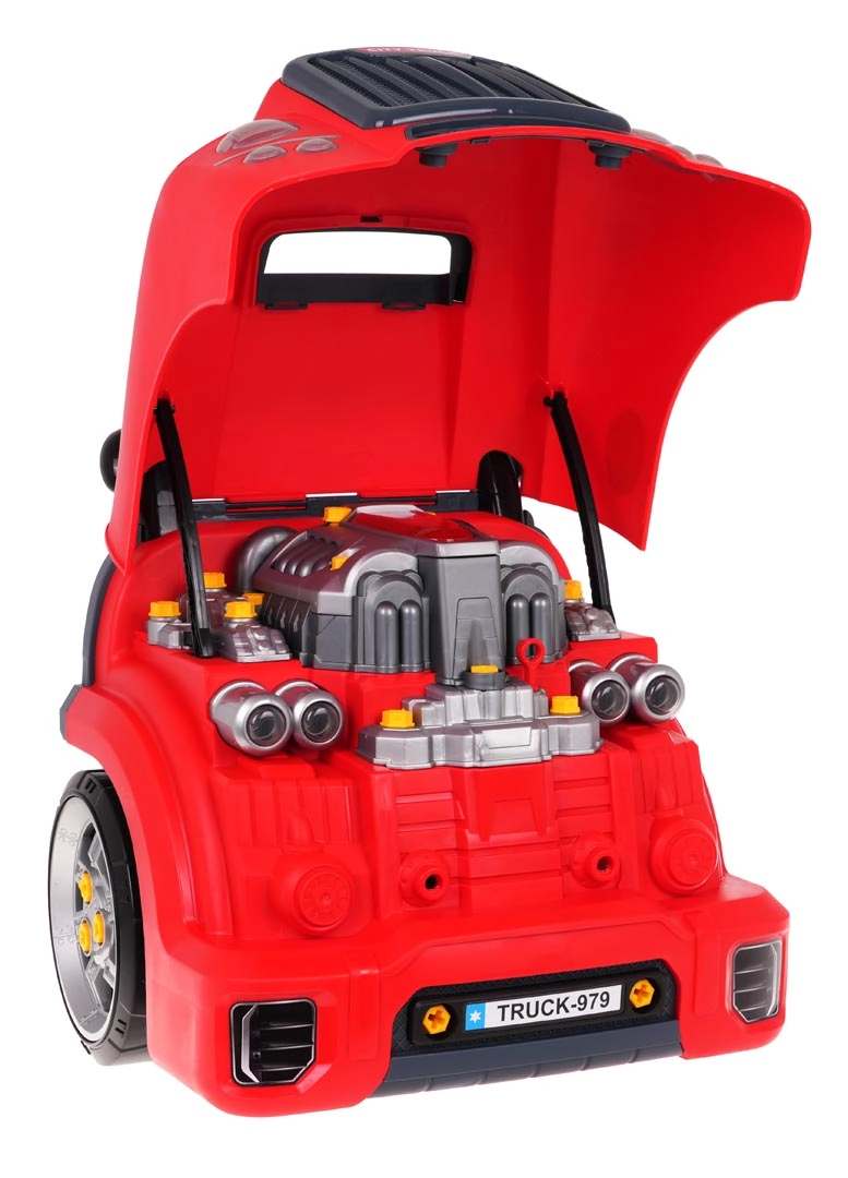Deze realistische interactieve set tovert kinderen om tot handige monteurs. De voorkant van de vrachtwagen met een opklapbare motorkap verbergt een grote demontabele motor, waar je bougies en wielen kunt wisselen. Op het dashboard vind je een startknop met startgeluiden, een stuur met claxon, een waarschuwingsindicator en een versnellingspook. De praktische draaggreep maakt vervoeren gemakkelijk en onder het stuur zit een opbergvak voor gereedschap en schroeven.