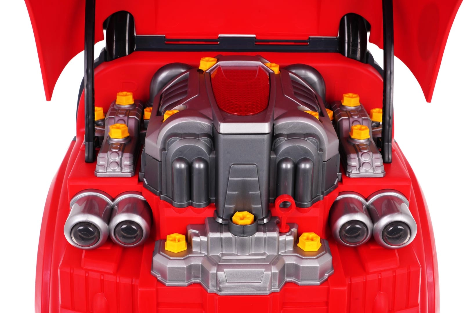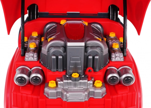 Onder de kap zit een grote motor die je kunt vastschroeven en uit elkaar halen – ideaal om fijne motoriek en logisch denken te trainen.
