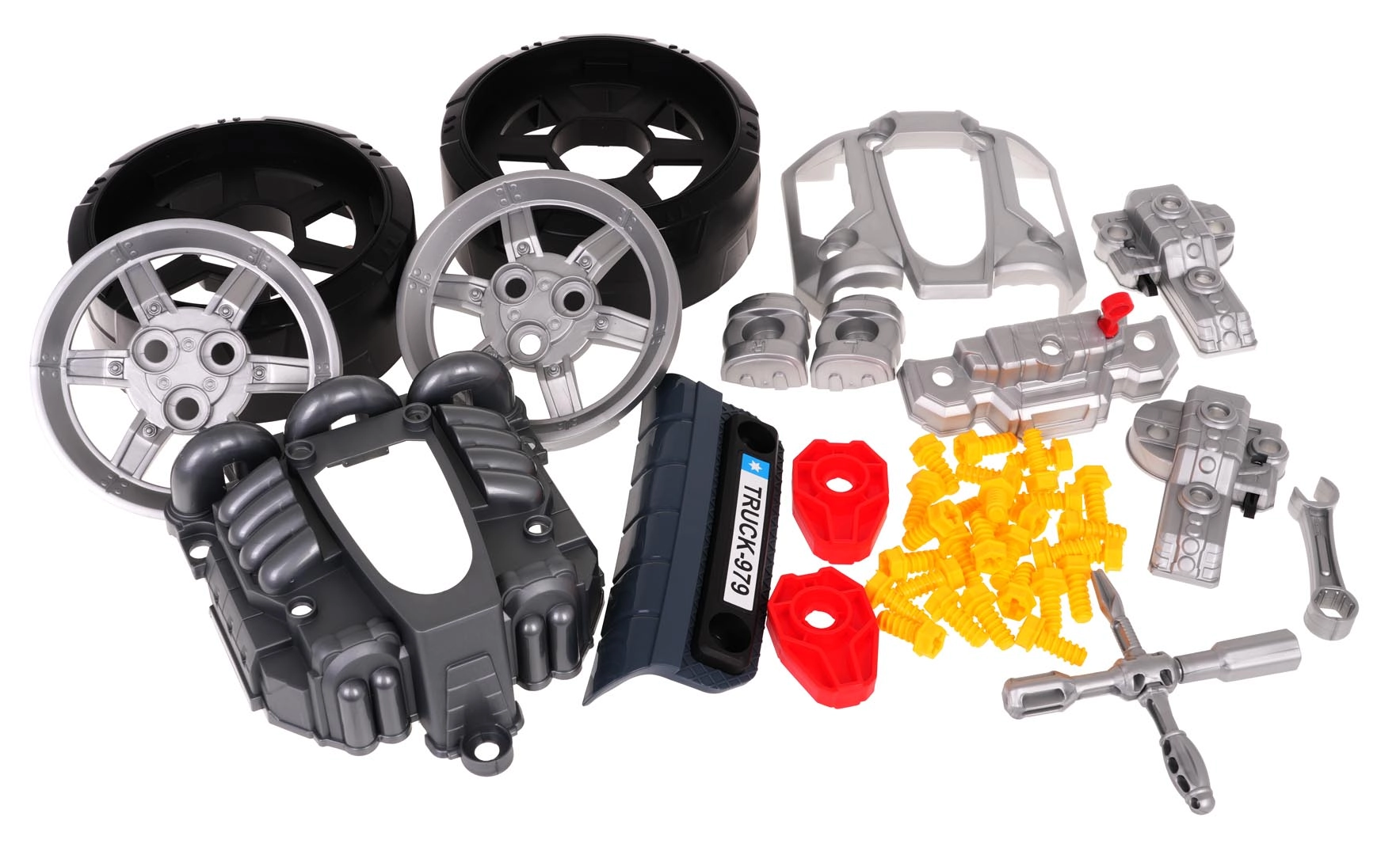 - Voorkant van de truck met motor, wielen met wieldoppen, 31 schroeven, gereedschap, decoratieve stickers, handleiding