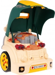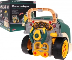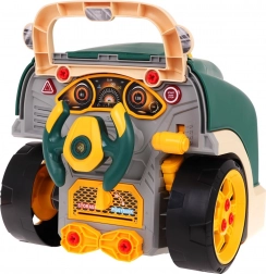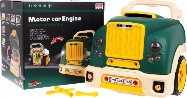 Interactieve set voor kleine monteurs in de vorm van de voorkant van een vrachtwagen, met realistische speelervaring dankzij lampen, geluiden en een demonteerbare motor. Kinderen oefenen hun fijne motoriek, oog-handcoördinatie en leren de basis van “reparaties” met schroeven, gereedschap en een functioneel dashboard met claxon en motorstart.