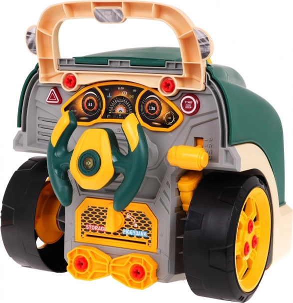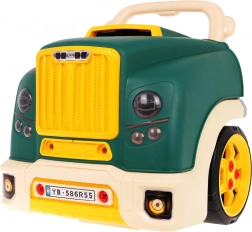 Deze groene voorkant van een vrachtwagen met een opklapbare motorkap biedt veel interactieve fun: een demonteerbare motor, brandende koplampen en authentieke geluiden van starten, rijden en achteruitrijden. Op het dashboard vind je een startknop, een stuur met claxon, waarschuwingssignaal en een versnellingspook. Onder het stuur is een praktische opbergruimte voor gereedschap en schroeven, plus een comfortabele handgreep om makkelijk mee te nemen.