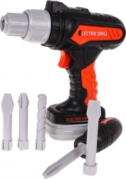 Kunststof elektrische boormachine met verwisselbare bits die eruitziet als een echte. Kan vast- en losdraaien, heeft een ergonomische vorm en een uitneembare “accu”. Voeding 2× AA (niet inbegrepen).