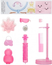 De roze afgestemde winterlook wordt compleet met bril, handtas, kam en een standaard om haar neer te zetten. Perfect voor stylen, spelen en fotograferen.