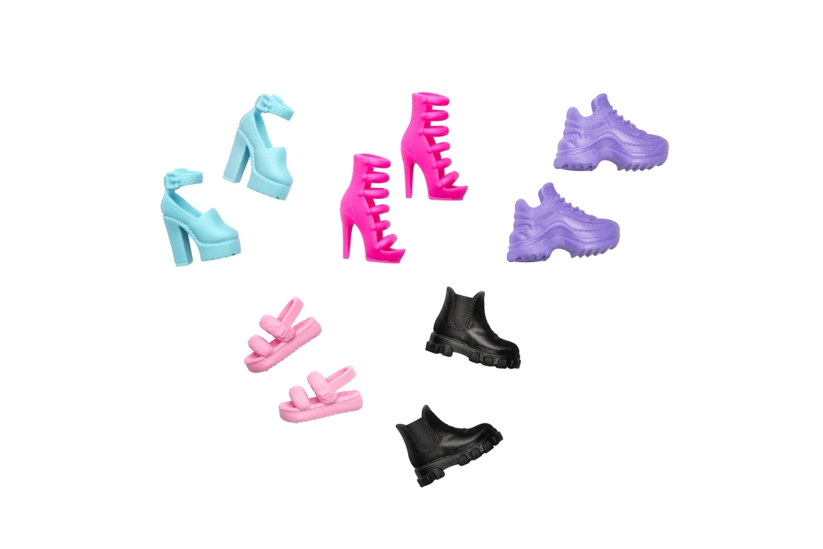Kleed de Barbie-pop voor elke gelegenheid met deze schoenencollectie geïnspireerd door de nieuwste schoenentrends! Deze set bevat een mix van kleuren en stijlen, zoals hakken, laarzen en sneakers, en omvat vijf paar Barbie-schoenen voor modieuze pret en veelzijdigheid! De schoenen passen op de meeste Barbie-lichaamstypes. Leeftijd 3+