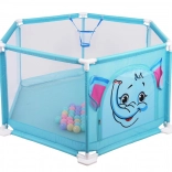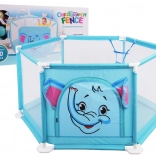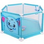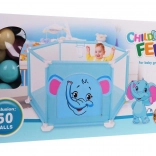 Lichte en stabiele kinderbox met een vrolijk olifantenmotief, transparante gaaswanden en een set van 50 ballen. Biedt een veilige speelplek binnen en buiten, is gemakkelijk te reinigen en te desinfecteren en dankzij de ritsopening kunnen kinderen zelf naar binnen en buiten kruipen. Inclusief een mini basket voor ballen voor nog meer speelplezier.