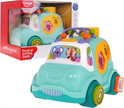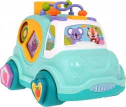 Interactieve sorteerbus voor kinderen vanaf 18 maanden ontwikkelt fijne motoriek, herkenning van vormen en kleuren en oog-handcoördinatie. Biedt licht- en muziekeffecten, vormen sorteren aan de zijkanten én in de wielen, het plaatsen van ratelende balletjes met een hamertje en een handig deurtje om de onderdelen makkelijk te verwijderen.