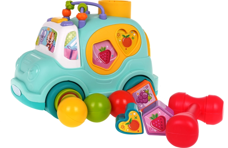 Kinderen oefenen vormherkenning en coördinatie dankzij openingen aan de zijkanten en unieke openingen direct in de wielen van de bus.