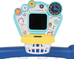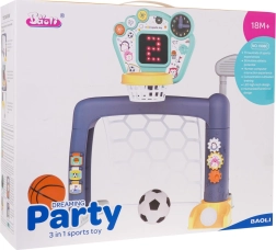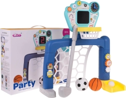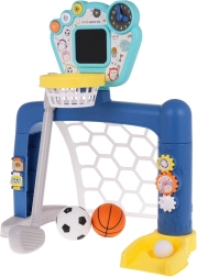 Interactieve 3-in-1 set voor voetbal, basketbal en golf, voor kinderen vanaf 18 maanden. Op het paneel staan drie knoppen om tussen modi te schakelen. Het speelgoed werkt op 3 AA 1,5 V-batterijen (niet inbegrepen). .Speelgoedmodi: . - FUN-knop: kinderen luisteren naar de instructies en volgen ze daarna, .- BEWEGING-knop: activeert afbeeldingen op het bord samen met geluiden en muziek, .- UITSCHAKEL-knop: het kind bedient de resultaten op het bord. .Functies van het speelgoed: . - geschikt voor kinderen ouder dan 18 maanden, .- 3 spellen om uit te kiezen: golf, basketbal, blik met bal; diverse speelmogelijkheden, .- klok met beweegbare wijzers om de tijd te leren, .- tandwielen om precisie te oefenen, .- in elkaar te zetten schijven, .- interactief paneel met geluids- en lichteffecten. |