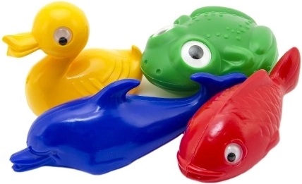 Schattige set voor waterpret met 4 plastic diertjes – een gele eend, een blauwe dolfijn, een groene kikker en een rood visje. Ideaal voor bad en zwembad en geschikt voor kinderen vanaf 0+.