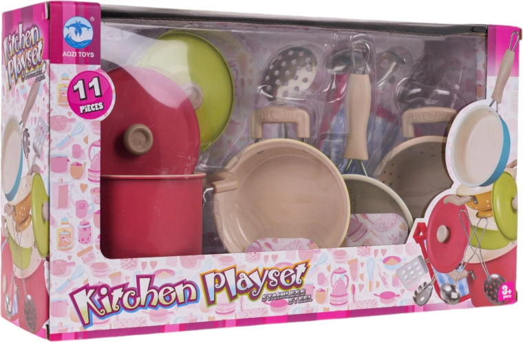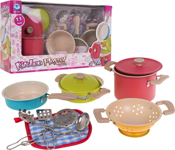 Prikkel de fantasie van kinderen met een 11-delige set van metalen kookgerei en tools voor kleine koks vanaf 3 jaar. De set bevat potten met deksels, een pan, een vergiet en hulpmiddelen en valt op door levendige kleuren, duurzame metalen uitvoering en rijke uitrusting voor realistisch kookspel.