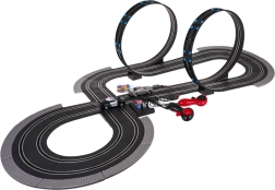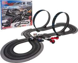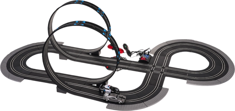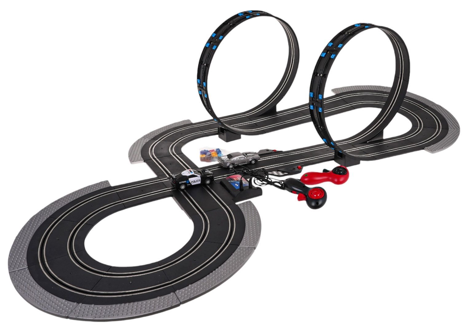 | Bekijk hoe het werkt. | Met de afzonderlijke bouwblokken bouw je een baan met scherpe bochten, spiralen en rechte stukken, allemaal voor maximaal speelplezier en extra spanning tijdens het spel. De set bevat twee voertuigen, waaronder één politieauto. De auto’s hebben te openen motorkappen. De set is ideaal voor kinderen vanaf 6 jaar. Het speelgoed werkt op 6 x AA 1,5V batterijen (batterijen niet inbegrepen). Functies van de set - geschikt voor kinderen vanaf 6 jaar, - gemaakt van lichte, hoogwaardige materialen, - de baan bevat rechte stukken, 360-graden loops, bochten, spiralen, - schaal 1:43, - set van 10 blokken om langs de baan te plaatsen, - voertuigen met te openen motorkappen, - baan kan op netstroom of op batterijen werken, - ronde-teller, - 2 snelheden. |