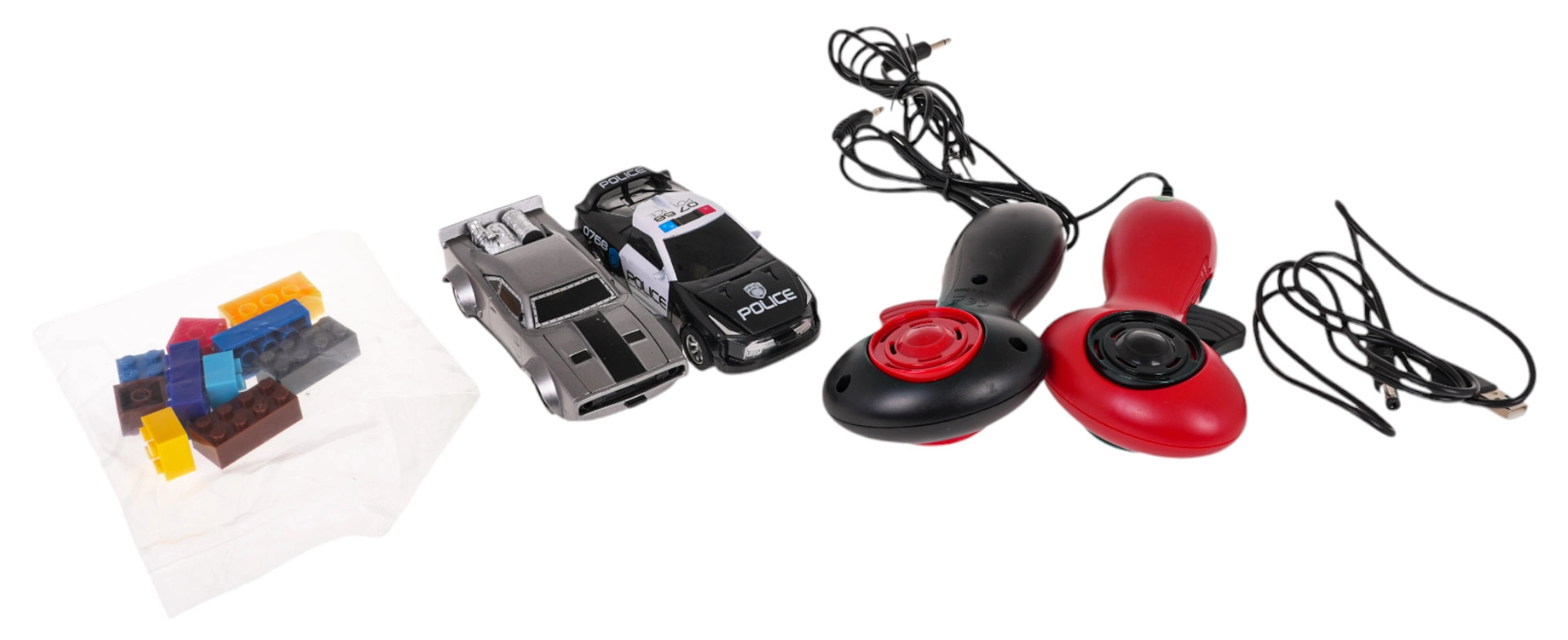 - baandelen, - 10 stenen/blokken, - 2 voertuigen, - 2 afstandsbedieningen, - USB-voedingsadapterkabel |