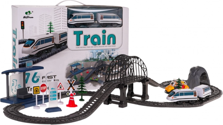 Ontdek het speelplezier met een complete set voor kleine machinisten: een treinbaan met station, brug en tunnel, een moderne trein en volop accessoires. De set met 76 onderdelen biedt licht- en geluidseffecten bij het station, magnetische koppeling en een taxi met figuurtjes voor nog creatiever spel. De trein rijdt vooruit en achteruit, de rails hebben stevige klikverbindingen en dankzij de hoogwaardige kunststof is de set bestand tegen dagelijks spelen.